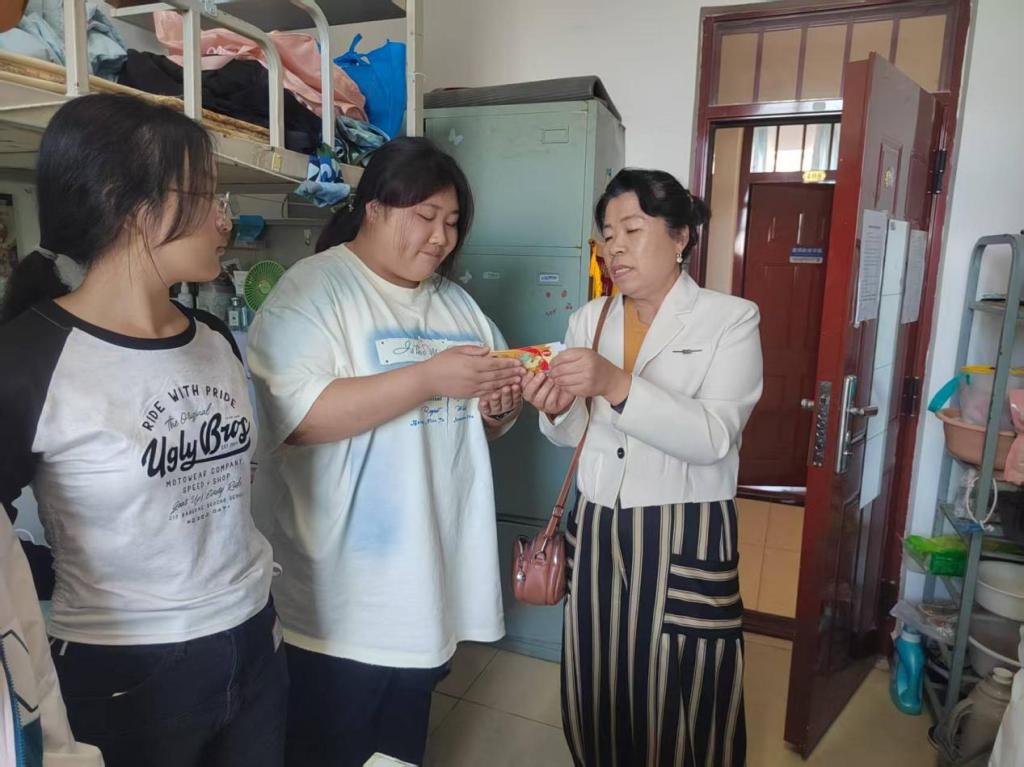 本次检查,重点围绕消防安全、用电安全及管制刀具三大核心维度展开。赵桂英书记强调:“寝室是学生在校期间学习生活的重要场所,安全是底线更是红线。全体学生要树牢‘安全第一’的意识,做好防火、用电安全,保障自身和他人的切身利益。”同时,赵书记还结合假期安全注意事项,向学生普及防盗防骗、出行安全、网络安全等知识,提醒学生离校前务必切断电源、锁好门窗,增强安全防范意识和自我保护能力。之后,赵书记还为假期留校的同学赠送了月饼券,叮嘱和关照留校学生假期作息和外出游玩的注意事项。